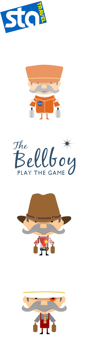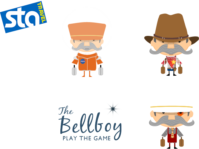Illustrations of Bellboy character designed for proposed online interactive game for STA Travel. The illustrations reflect the different environments that the main character explores